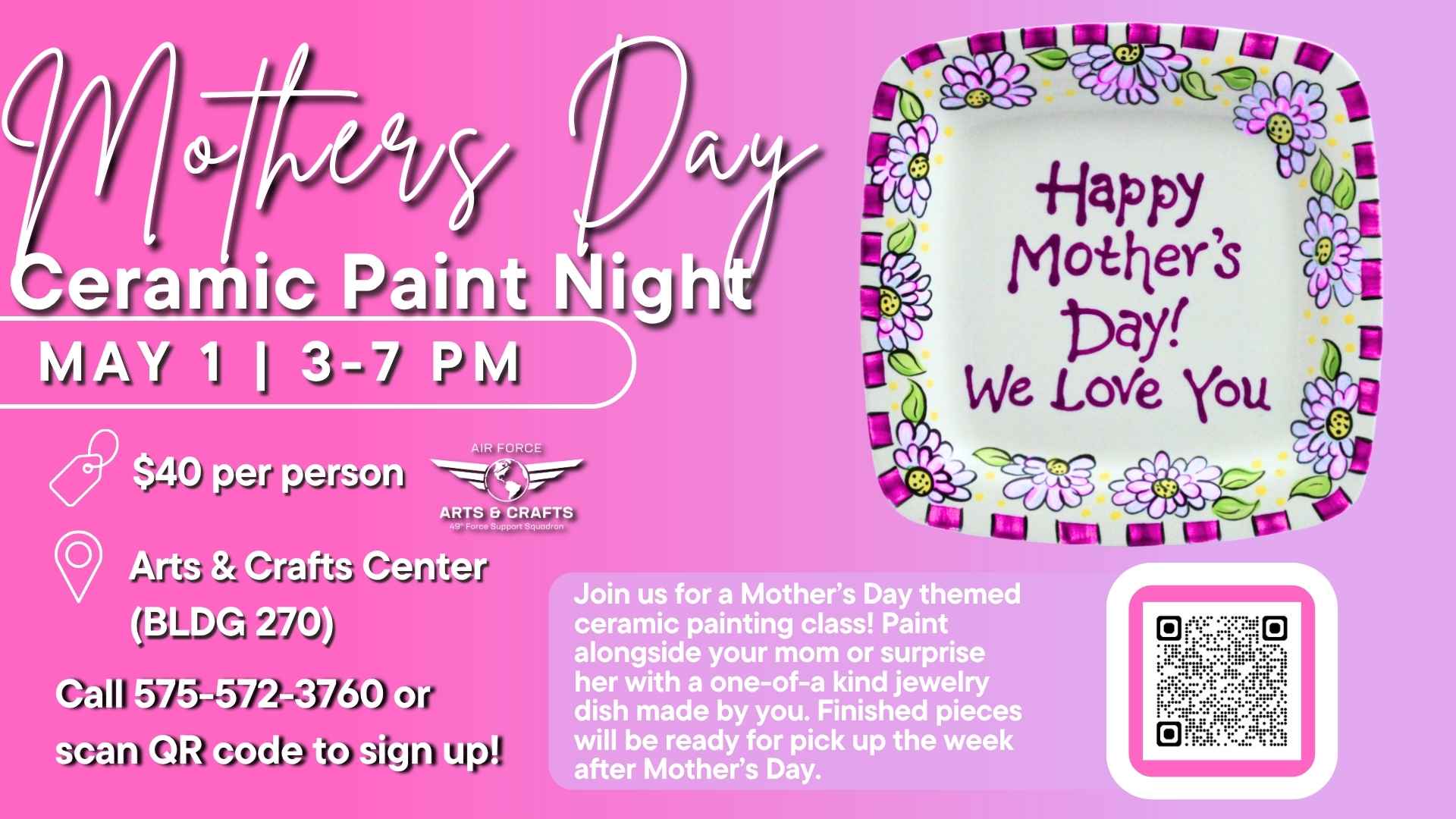Join us for a Mother’s Day Ceramic Paint Night on May 1 from 3–7 PM at the Arts & Crafts Center (Bldg 270)!