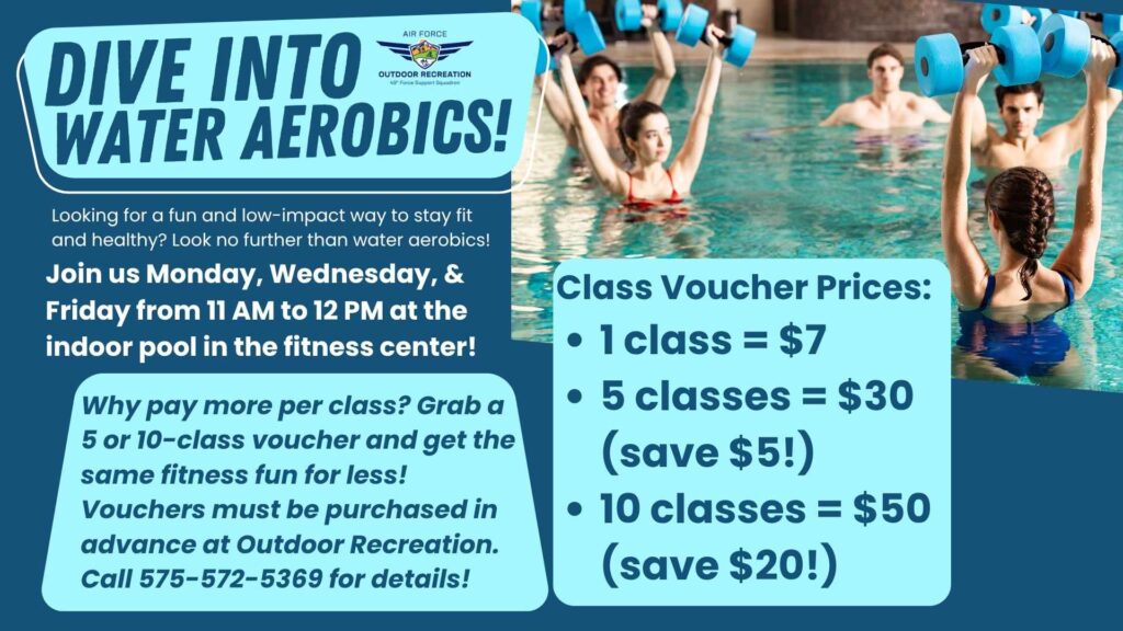 Looking for a fun, low-impact way to stay active? Join us for Water Aerobics every Monday, Wednesday, and Friday from 11 AMโ€“12 PM at the indoor pool in the fitness center! This class is perfect for boosting strength, mobility, and overall fitnessโ€”all while going easy on your joints.